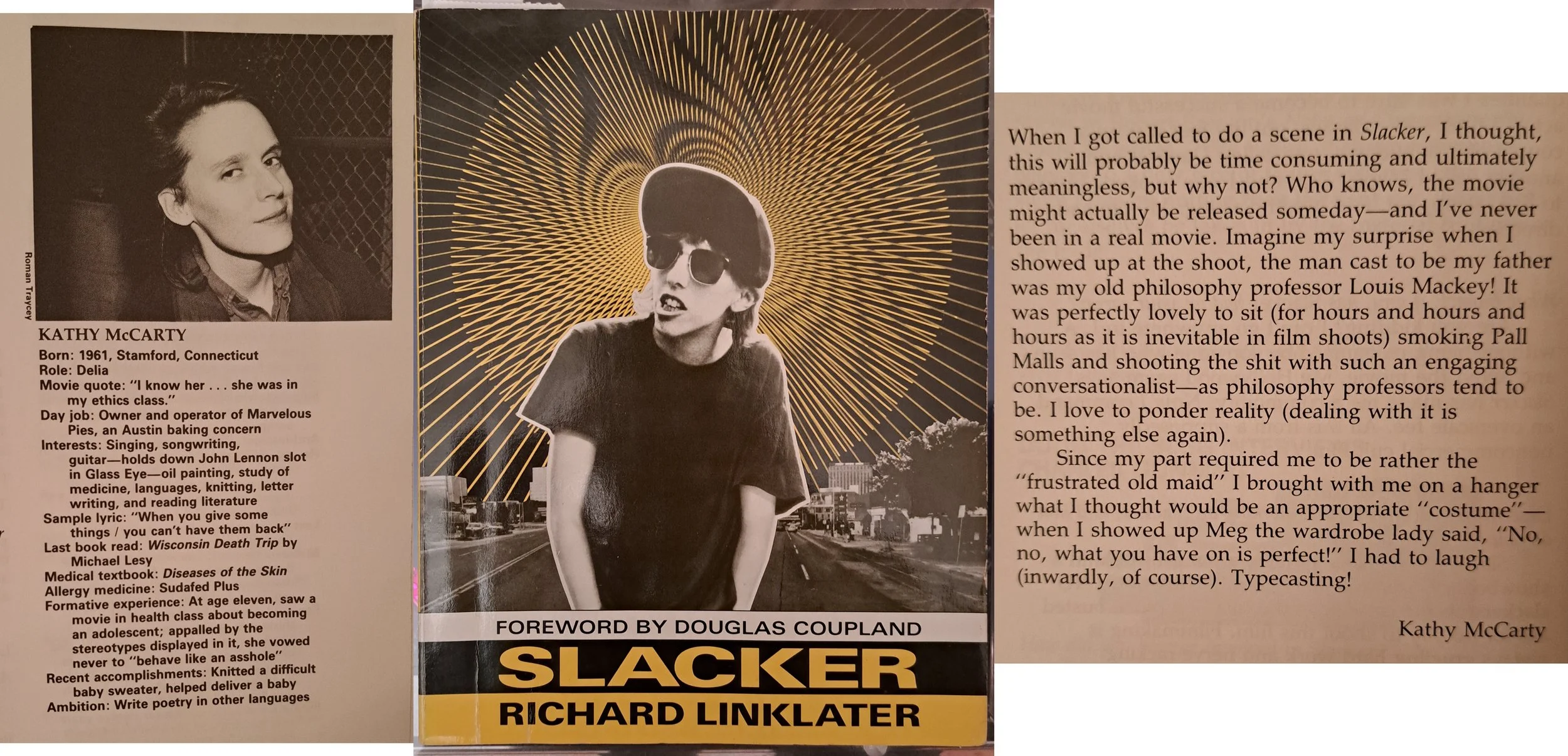 The name “Kathy McCarty” seemed familiar to me, I remembered where I had seen it. She had acted in Richard Linklater’s 1990 debut film Slacker. I loved Slacker and while in the US in 1992 I had purchased the movie tie-in book. It has Linklater’s script, his making of notes and reminiscences on how he put the project together. As if I needed more reasons to buy this beautiful book - it also has an introduction by Douglas Coupland and by 1992 I was mildly obsessed with Coupland’s Generation X and Shampoo Planet. The book features side panels with short bios of all of the movie’s cast. There was Kathy McCarty!