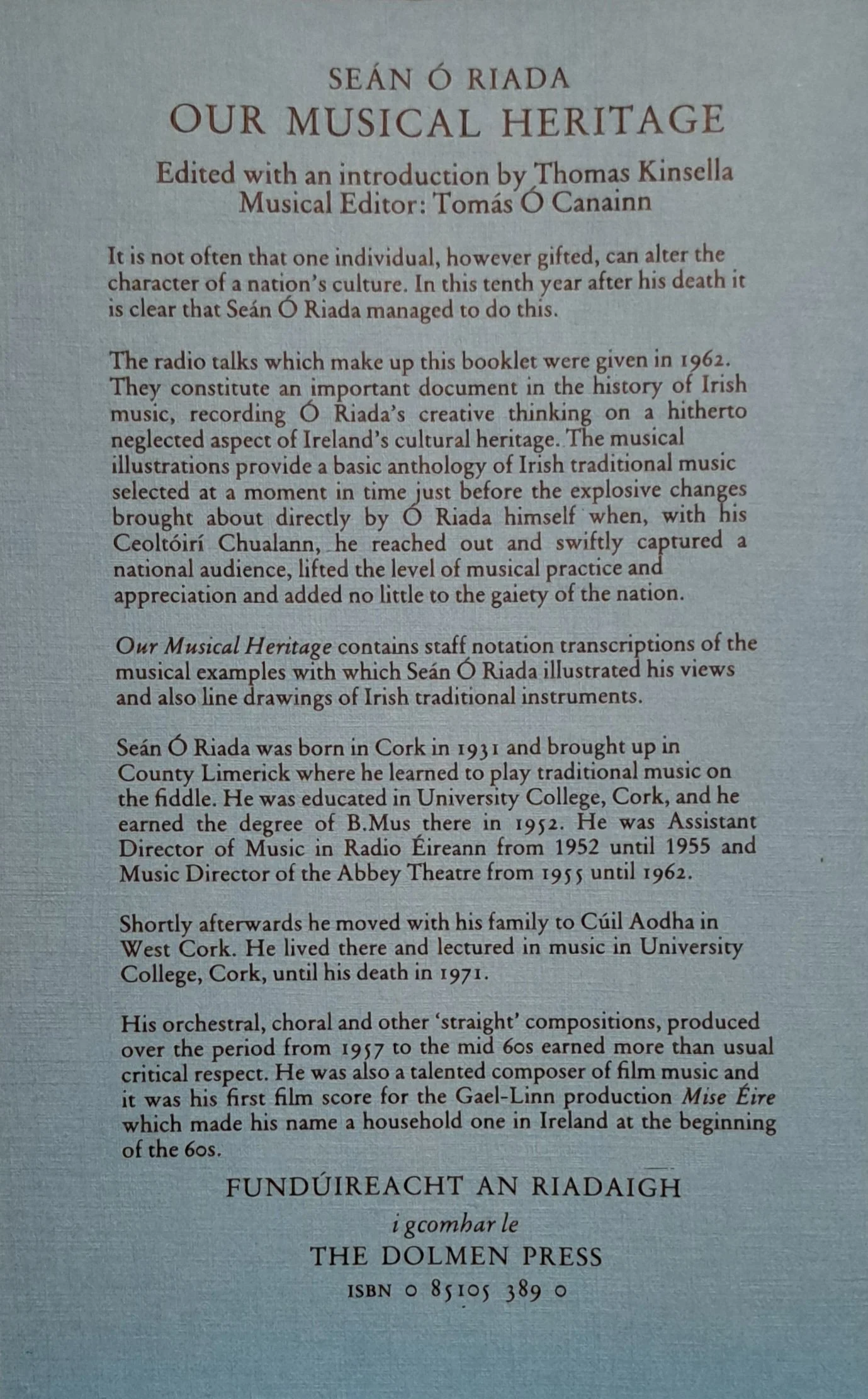 “It is not often that a single person, however gifted, can alter the character of a nation’s culture. Ó Riada managed to do this. The preparation of these talks was part of a process of creative exploration and recovery. It helped him to establish a necessary order and settle a strong foundation for his masterly practice.”