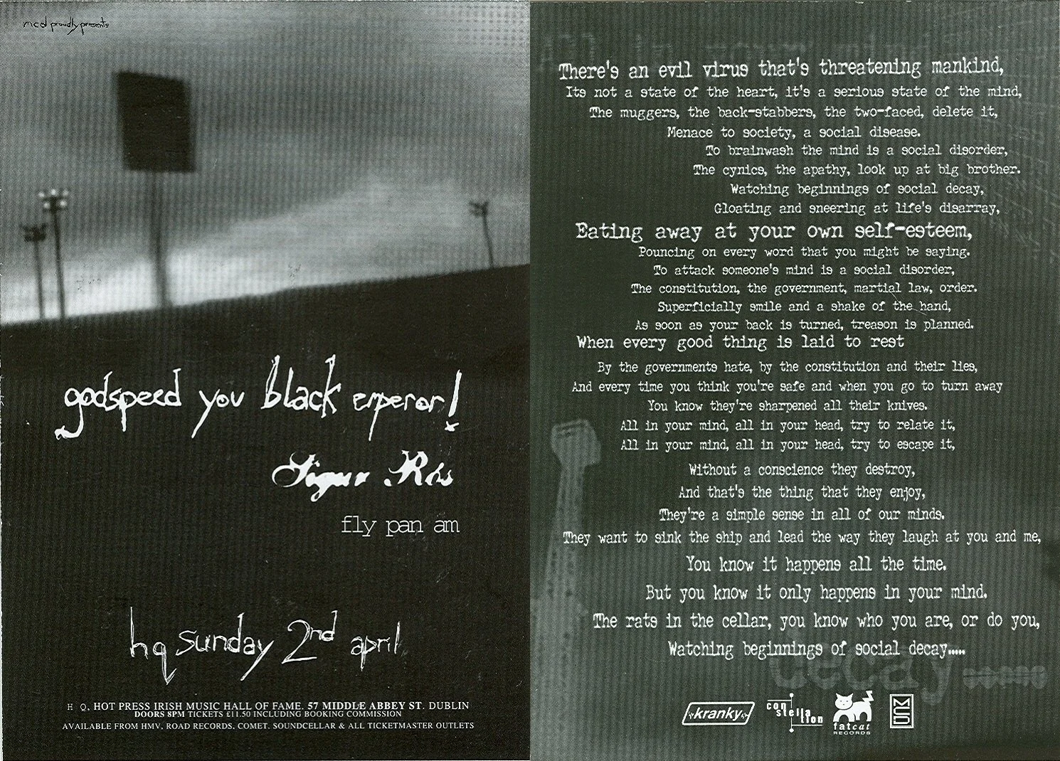 Flyer (front and back) for Godspeed You! Black Emperor, Sigur Rós and Fly Pan Am gig, 02 April, 2000. The flyer mentions Hq but the gig was moved to the Temple Bar Music Centre. Flyer scanned by Paul McDermott.