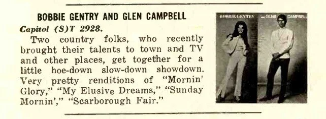 “Taken separately, Bobbie Gentry and Glen Campbell are each gifted with an agreeable, easy charm and disciplined expertise. Together they are devastating,” continued the review.