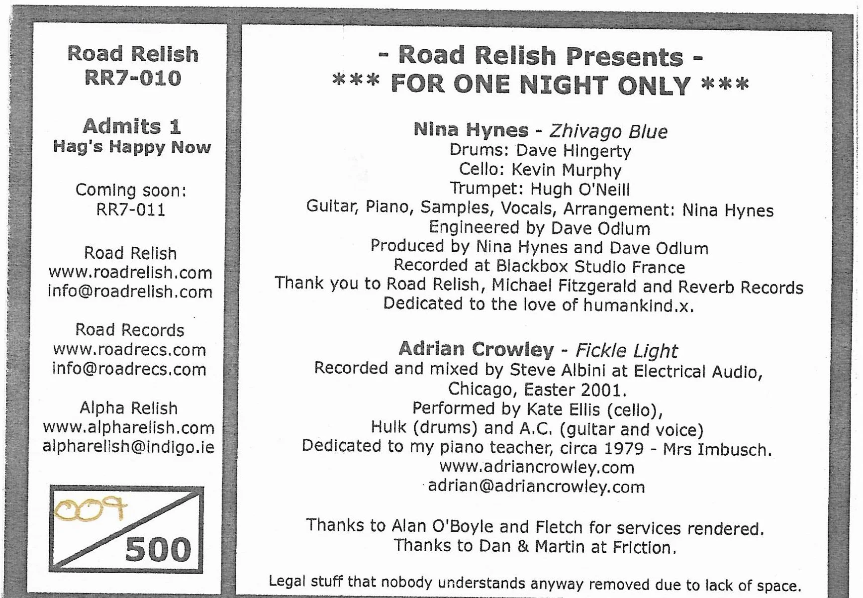 Nina Hynes/Adrian Crowley - “Zhivago BLue”/”Fickle Light” (Road Relish #10, 2002). The tenth 7” in a series of 14 released by Road/Relish (record shop Road Records and promoters Alpha Relish) between 1999 and 2004. Each 7” was limited to 500 copies.