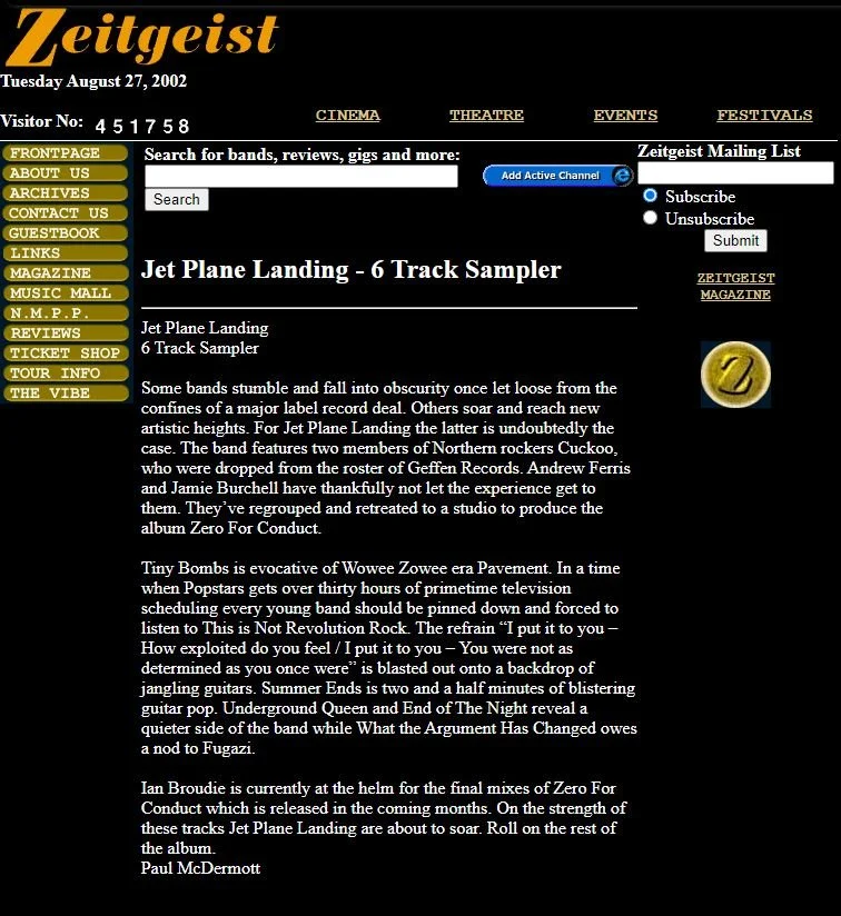I’ll go along with that. Jetplane Landing didn’t appear from nowhere – Andrew was the guitarist with Cuckoo and Jamie had joined on bass after some line-up changes. When Cuckoo disbanded in the late 90s Andrew and Jamie regrouped as Jetplane Landing.