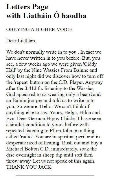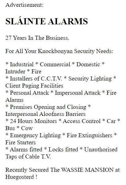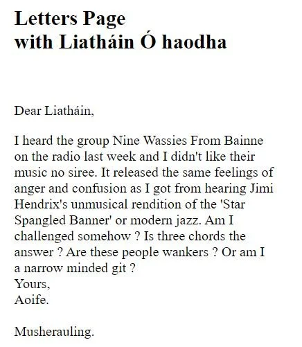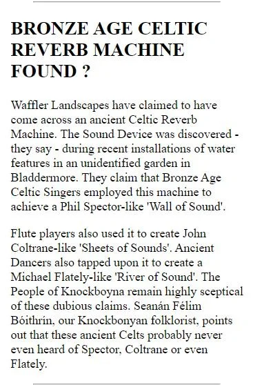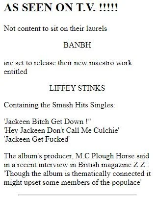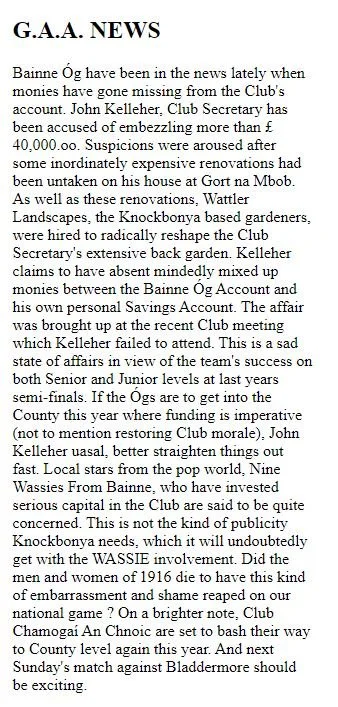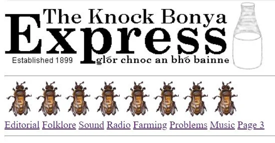 “Cork band Nine Wassies From Bainne are a pretty kooky lot, and their Website at lives up to their image as acid-fried gaelgeoiri. It’s designed as a fictional local newspaper, The Knock Bonya Express, whose features include a hot debate between Irish language revivalists and “Cromwell-loving sleveens”, plus an adult-only “bovine line” where you can dial such hot numbers as ‘3 heifers in a bed’ or ‘hear me moo’. There’s also news of The Wassies’ gigs and record releases, but that’s just a sidebar to the big story about late milk deliveries to Knock Bonya.”