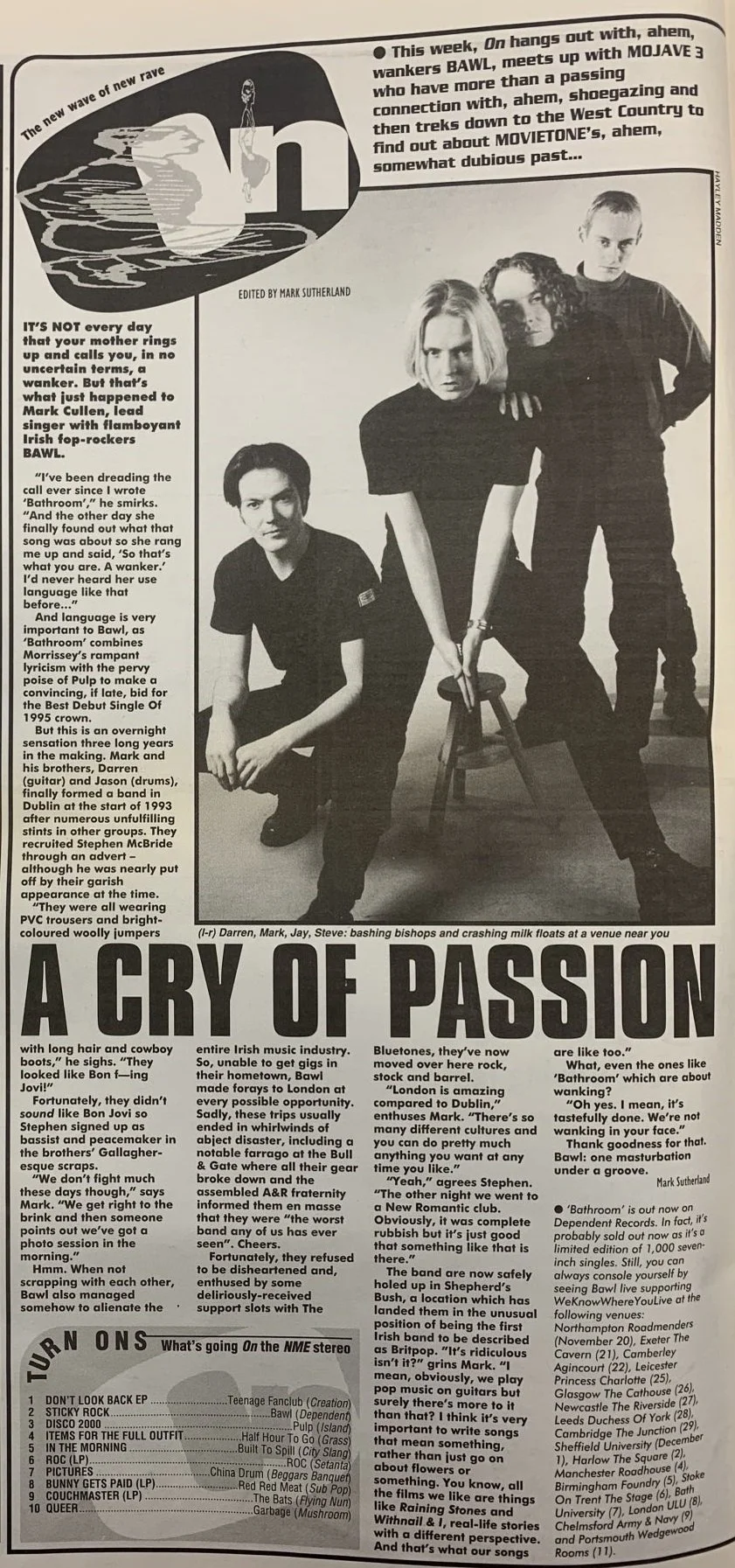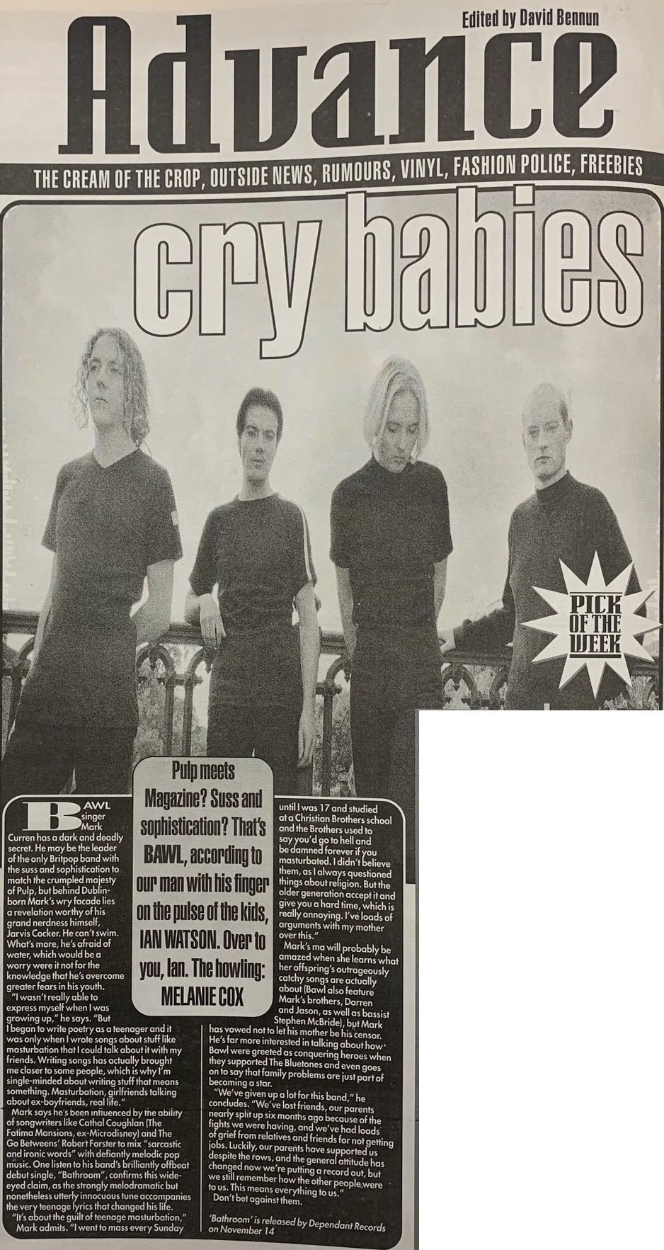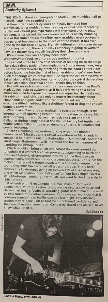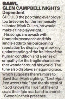 The first thing I ever read about Bawl described them as “Pulp meets Magazine” and in the same Melody Maker piece Mark mentioned been influenced by both Cathal Coughlan and The Go-Betweens’ Robert Forster: